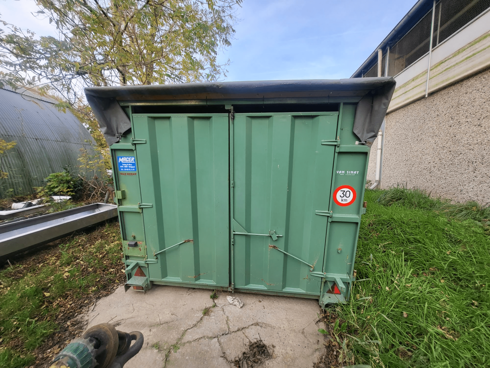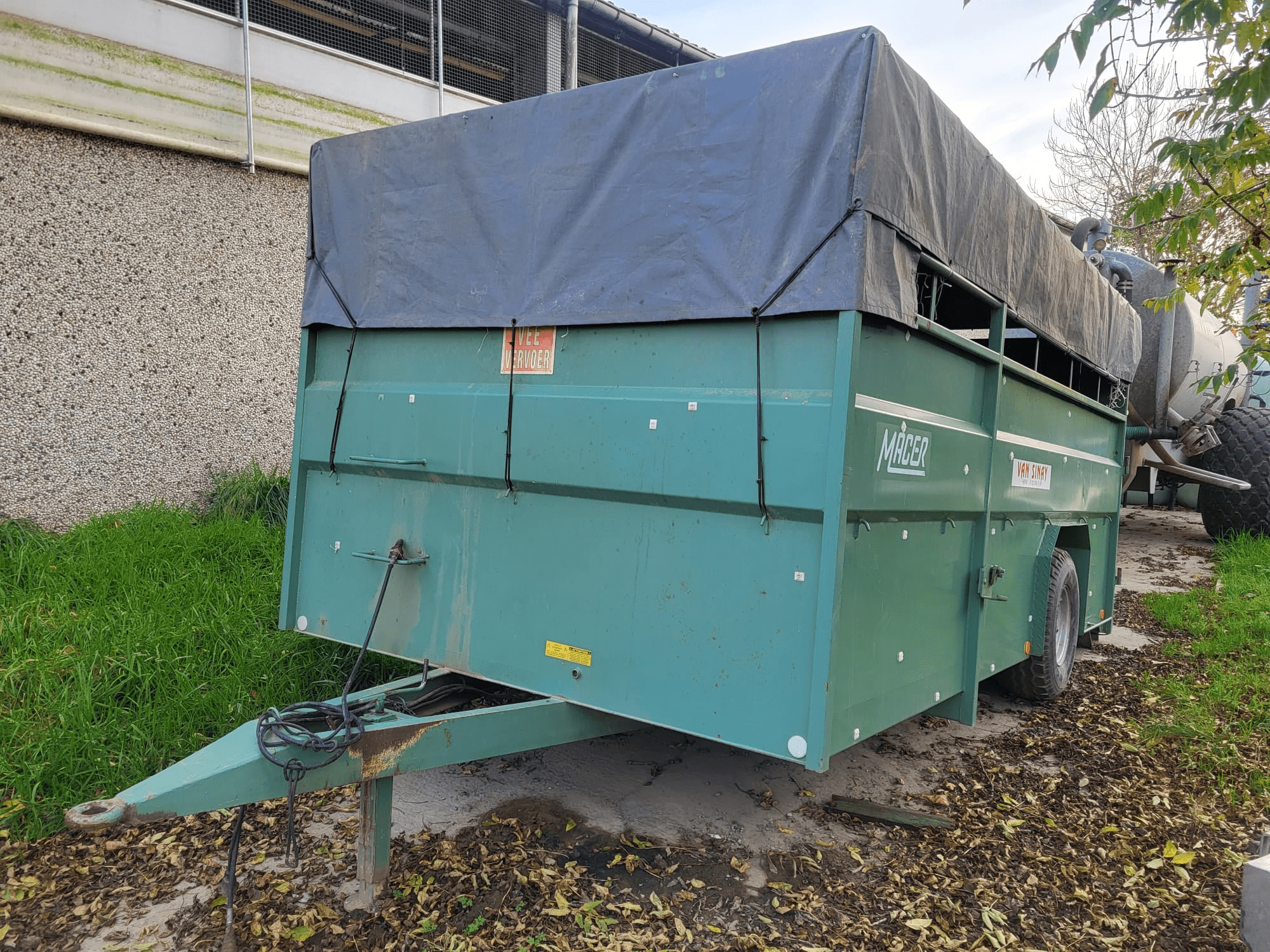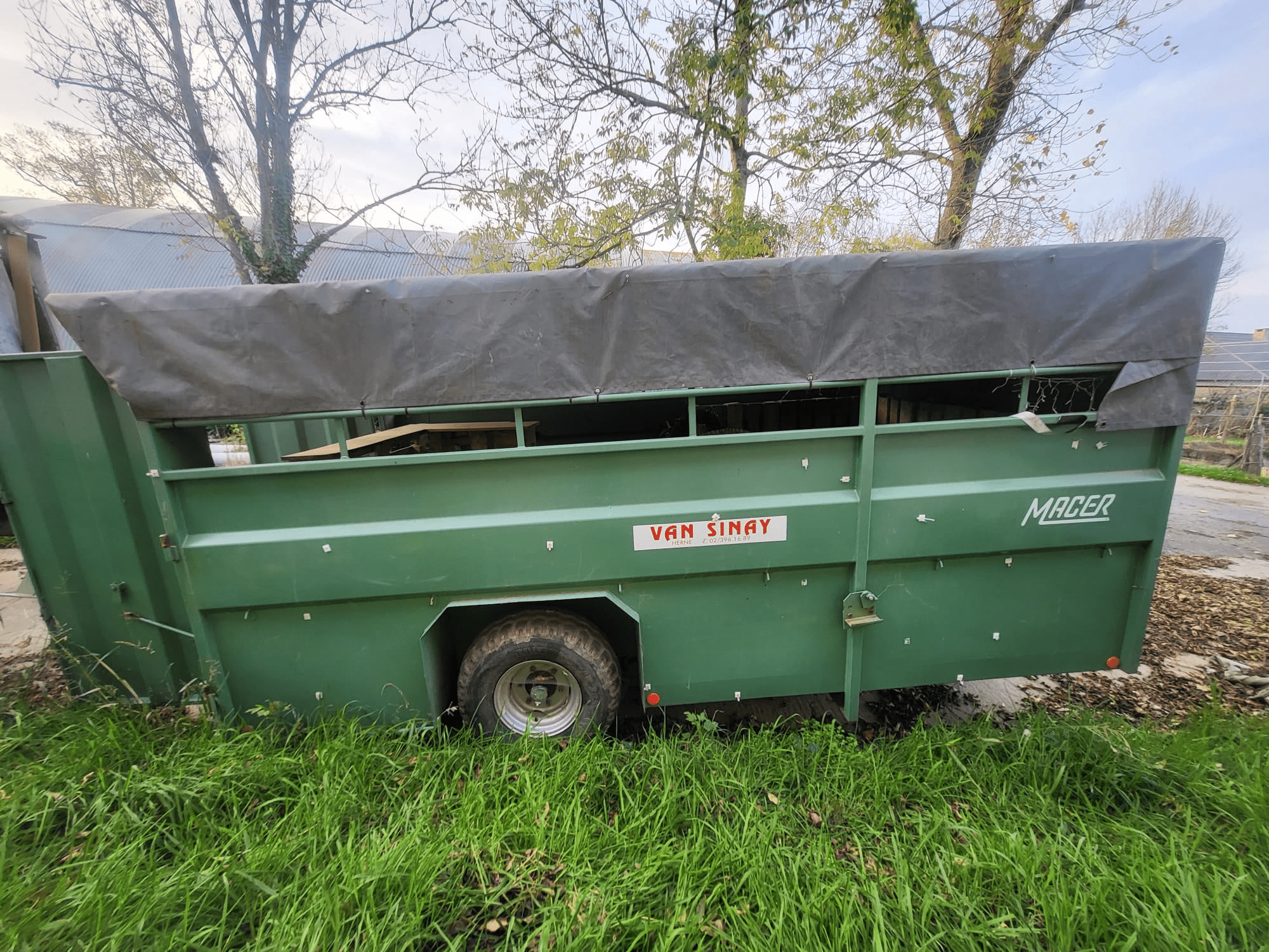 bétaillère MACER type BT7H, 4,5 m, Pose à terre Hydraulique, Frein hydraulique, très bon état, peu servi = peinture d’origine encore sur le plancher, recouvert d’une bâche.